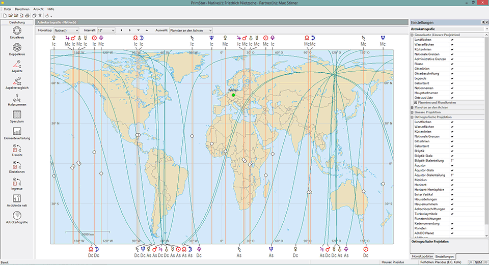 eingebaut. Hier werden auf einer Weltkarte die Positionslinien der Planeten an den vier Horoskop-Ecken gezeichnet. Der geografische Breitenbereich der Weltkarte erstreckt sich von 85° Nord bis 60° Süd.
