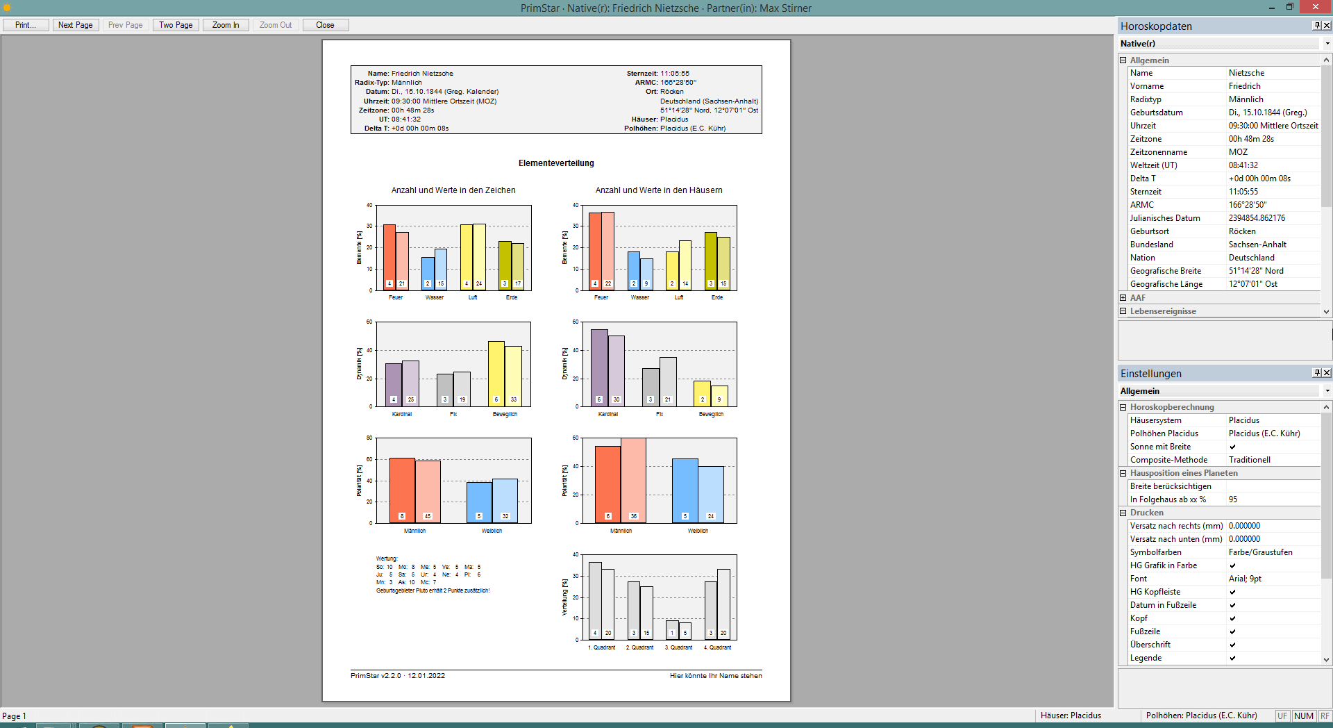 Im Abschnitt Das Konzept von PrimStar wird auf einen erhöhten Papieraufwand hingewiesen, der sozusagen den „Preis” für das Druckprinzip in PrimStar symbolisiert. In diesem Zusammenhang sind nachfolgend vier Seiten aus der Druckvorschau abgebildet, deren Informationen in anderen Programmen meistens auf einer DIN A4-Seite untergebracht sind. Es handelt sich dabei um die Kreisgrafik, das Speculum, die Aspekte und die Elementeverteilung. Durch die Verteilung auf mehrere Seiten gibt es weder inhaltliche noch optische Einschränkungen bei den dargestellten Informationen.